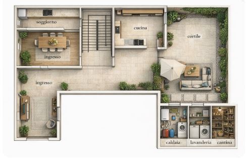 Al piano terra troviamo l’ingresso, un luminoso soggiorno e la cucina abitabile con affaccio sul cortile privato.