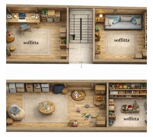 Al secondo piano si sviluppa il sottotetto, con un grande spazio mansardato e un’ulteriore camera.